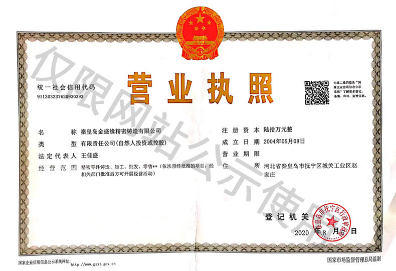 秦皇島金盛緣精密鑄造有限公司是ISO9001:2000認證企業。專業生產各型碳鋼,低合金鋼,不銹鋼以及銅,鋁等有色金屬精密鑄件。公司位于秦皇島市撫寧縣城關工業開發區,西接京,津,唐東臨著名旅游避暑勝地北戴河,交通便利。